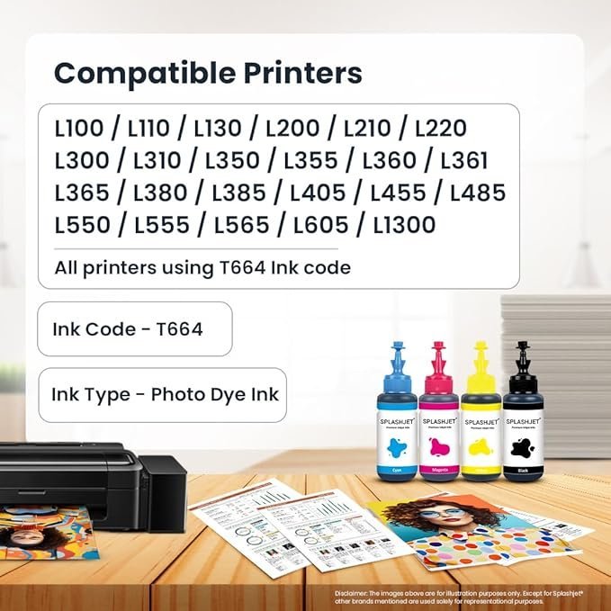 Splashjet T664 Compatible Refill Ink for Epson L130, L360, L380, L361, L565, L210, L220, L310, L350, L355, L365, L385, L405, L455, L485 Printers (C/M/Y/Bk – 70g x 4) – 501756