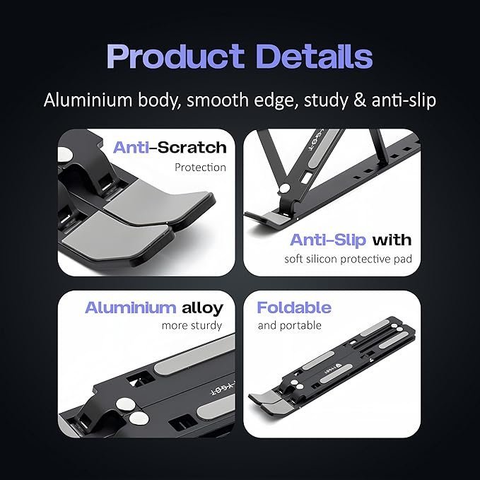 - [SOLID & LIGTHWEIGHT]-It is made up of Aluminium alloy and Silicone Rubber pad, making it tough yet lightweight and elegant. Get six angles to view the screen as per your convenience.